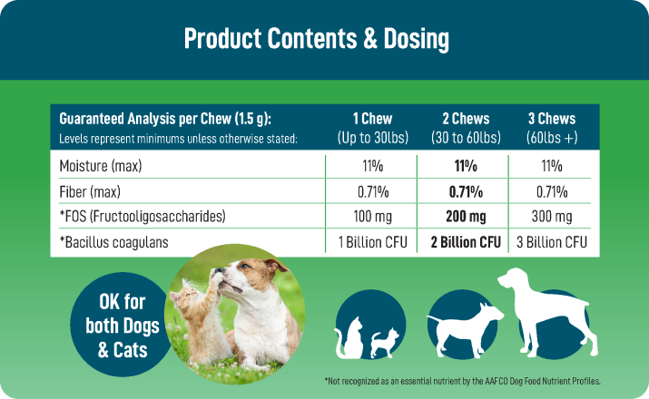 - INCLUDES 1 BILLION CFU OF LONG-LIVED CULTURES: Includes Bacillus Coagulans, a probiotic that performs exceptionally well in stability testing. We include far more than the label claim to ensure that 1 billion live cultures per chew survive through the expiration date.